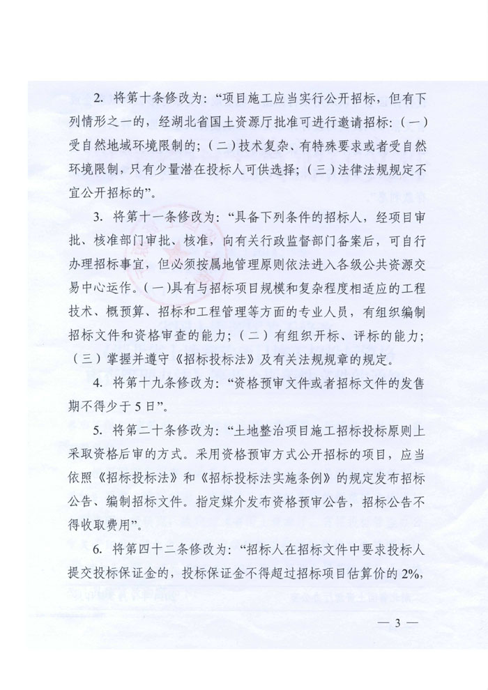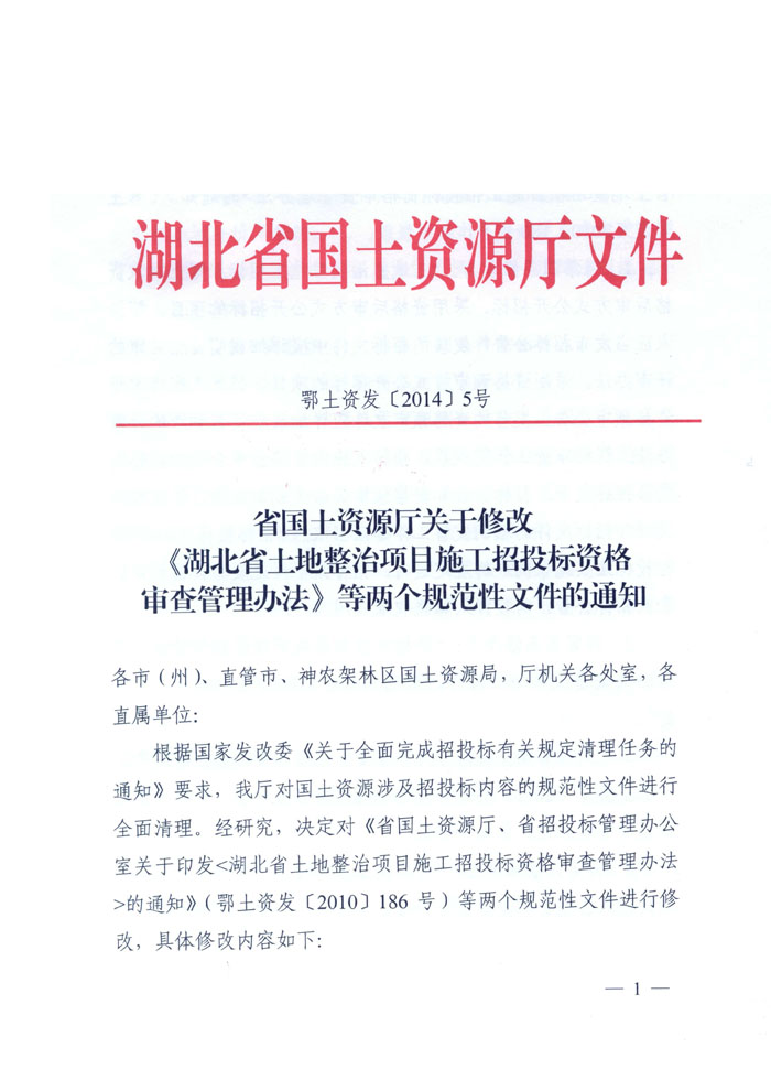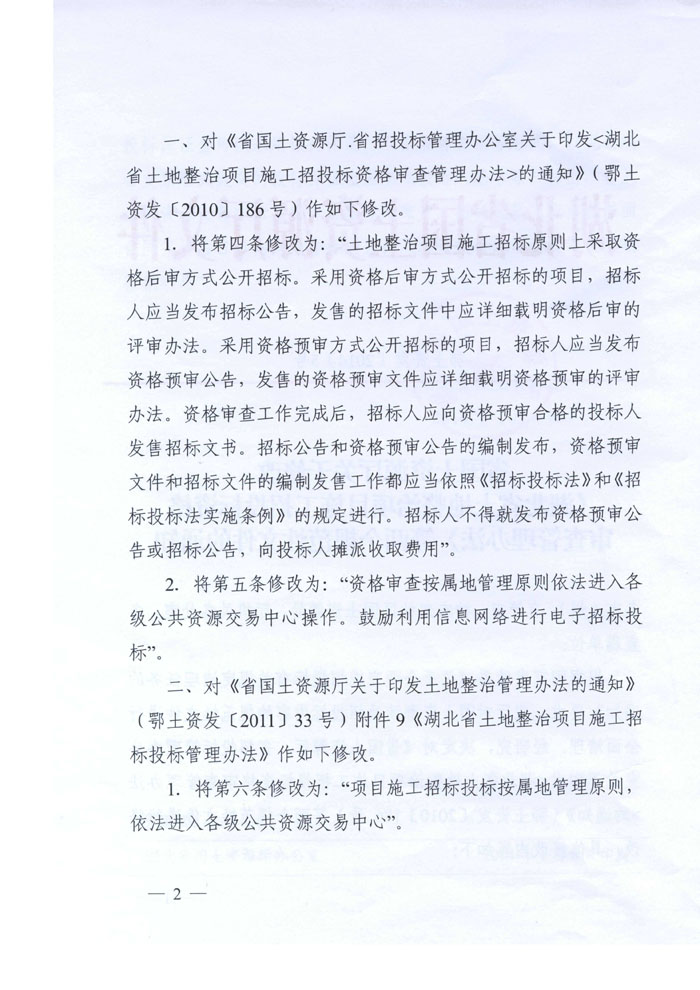 湖北省国土资源厅关于修改《湖北省土地整治项目施工招投标资格审查办法》等两个规范性文件的通知
